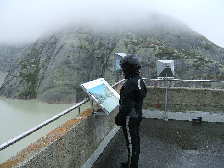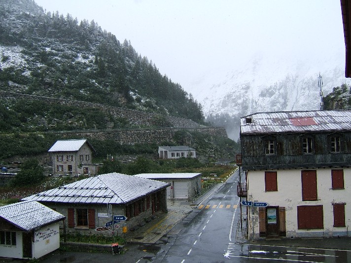 Dienstag Hurra!!! Die Klamotten sind trocken, wir haben hervorragend geschlafen, draußen ist es diesig bei nur 10Grad, aber immerhin, es regnet nicht. Unsere Tour(die gestrige Pfalztour hatten wir übrigens gestrichen und sind bis Baden Baden nur Autobahn gefahren) führt uns heute von Oberharmersbach, nördl. Schwarzwald auf schöner Strecke bis zum Süden des Schwarzwaldes, und von Rheinfelden bis Anfang Schweiz auf die Autobahn, um Basel etc. zu umgehen. Von dort auf ruhigen Straßen bis rauf zum Grimselpass. Bis Meiringen bleibt es mit ca. 10 Grad und diesig feuchtem Wetter sehr unangenehm. Aber ab Meiringen regnet und stürmt es wieder. Je höher wir jetzt kommen desto schlimmer und kälter wird es. Bis zum Pass sind es noch 60km und es fängt bald an zu schneien. Sehr schade, diese schön geplante Tour hätte ein echter Genuss werden können, jetzt bleibt uns nur noch die Möglichkeit auf der anderen Seite des Passes das erste Hotel auf zu suchen, denn es geht nichts mehr. Es ist ein wunderschönes altes, aber im alten Stil renoviertes Haus. Über die Preise mag ich hier nicht schreiben. Ist ja klar, wir sind in der Schweiz und dazu noch direkt an einem Pass, hier fragt man nicht nach Geld, hier zahlt man oder fährt weiter. Auf jeden Fall haben wir dick eingemümmelt wunderbar geschlafen. |
