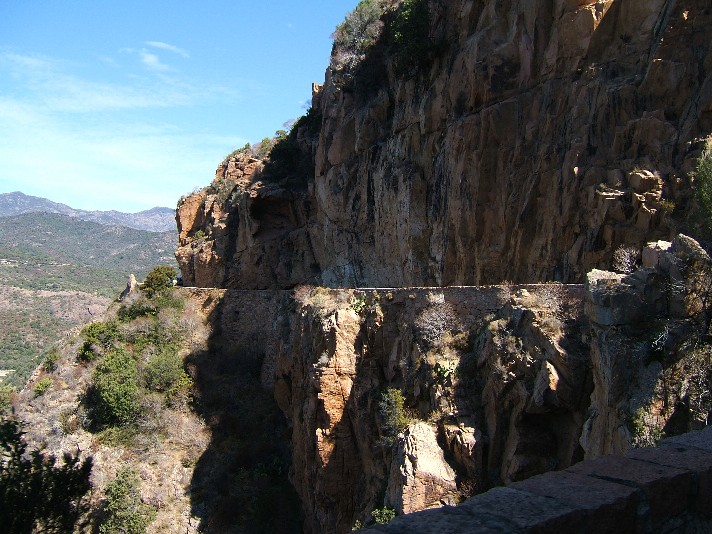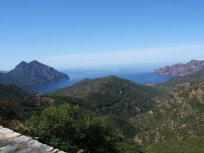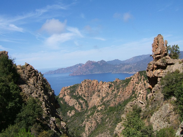 | Wir fahren zurück bis Galeria , weiter die Küstenstraßen entlang mit ihren grandiosen Ausblicken. Unter uns tiefblaues Wasser, weiße Gischt, bewaldete Hügel, und zerklüftete, teilweise dunkelrote zerklüftete Felsen. In dem schönen Städtchen Porto biegen wir links Richtung Evisa in die gewaltige Spelunca Schlucht. Wir fahren bis Evisa und drehen dort ab um den selben Weg zurück zur Küste zu nehmen. Richtung Evisa immer die gewaltigen Berge vor Augen, haben wir auf dem Weg zurück zur Küste die in der Ferne schimmernde Bucht von Porto vor Augen, zu welcher sich die Schlucht öffnet. Gewaltig und wunderschön. |