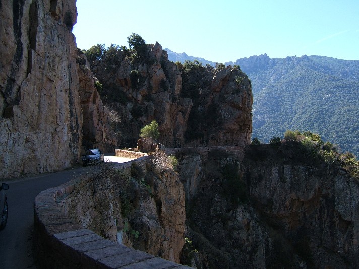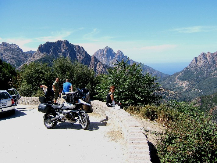 Die Strasse rauf bis Evisa ist sehr gut zu befahren, dort biegen wir rechts ab. Zum höchsten Col der Insel führt eine grandiose Strecke teilweise durch dichten Wald , dem Foret de Valdu-Niellu, auf deutsch Schwarzwald. Die Straße führt vorbei am Fluss Golo, in dem es viele Badestellen gibt, überall sind Picknickplätze angelegt, viele Trinkwasserquellen lassen den Motorradfahrer nicht verdursten. |