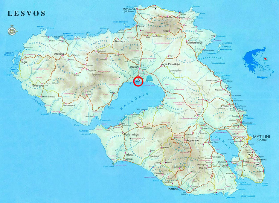 Kallonis. Als Kartenmaterial haben wir eine 1:70000 griechische Karte gewählt, aber hier heißt es aufpassen, die weiß eingezeichneten sind in der Regel nicht asphaltiert und oft in erbärmlichem Zustand!!! Ebenso abenteuerlich sind die Ortsdurchfahrten in den kleinen Bergstädtchen!!! Die Straßen??? Nur Kopfsteinpflaster, maximal 1,5 Meter breit mit irren Kehren und rauf und runter!!! Die Häuser stehen dermaßen eng zusammen, das mitunter die Straße von Hauseinfahrten nicht zu unterscheiden sind!!!!