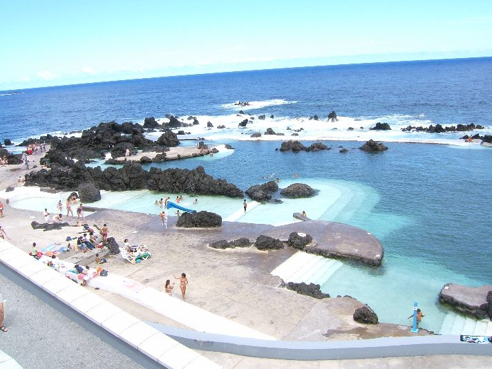 Im Ort sind die Piscinas Naturales traumhafte Felsbadebecken mit glasklarem Wasser, von der Natur im Lavagestein geschaffen, in denen man, immer wieder von kalten Duschen aus den Brechern des Atlantiks übersprüht, baden kann. In durchgeschwitzter Kombi macht das schon etwas neidisch. Als sicherheitsbewusster Mopedfahrer sind wir natürlich in voller Montur unterwegs. |