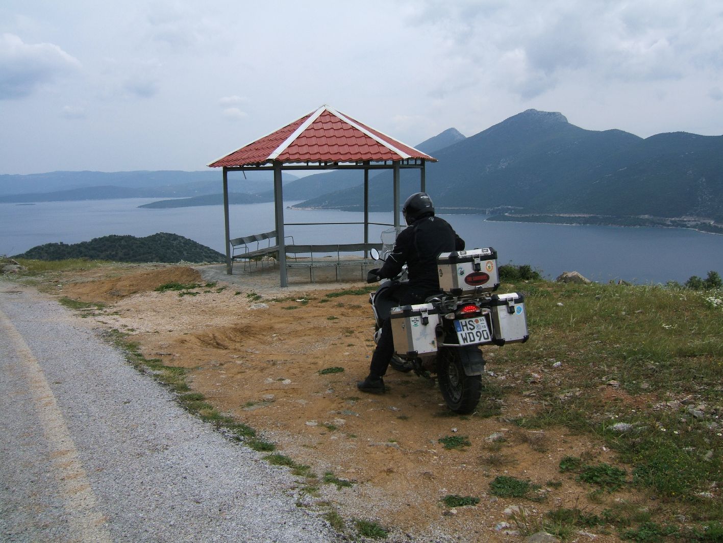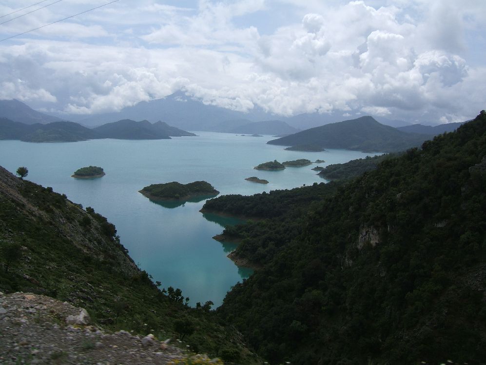 In unendlichen Kurven vorbei an kleinen Gebirgsdörfern, mal schroffe Gebirgswelt, mal inmitten dunkler Wälder bis Halkiopoulo, dann links über einen großen See Richtung Frangista. Dieser Stausee erinnerte mit seinen vielen kleinen Inseln, dem tiefblauen Wasser ein wenig an die Südsee |