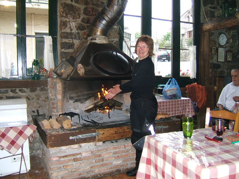 In einer kleinen (3Tische, 10 Stühle), super -super gemütlichen, urigen (ich habe gar nicht genug Worte!) Taverne am Marktplatz gelingt uns dies auch. In typisch griechischer Gastfreundschaft (Geschäftstüchtigkeit) werden wir warm und satt. Der Chef des Hauses wird von irgendwo her geholt um den Kamin an zu machen und zu kochen. Die Chefin selber empfiehlt uns ihre selbstgemachten Biftekis, auf Kosten des Hause noch einen Teller Bohnensuppe, so fahren wir gut gestärkt weiter. |
