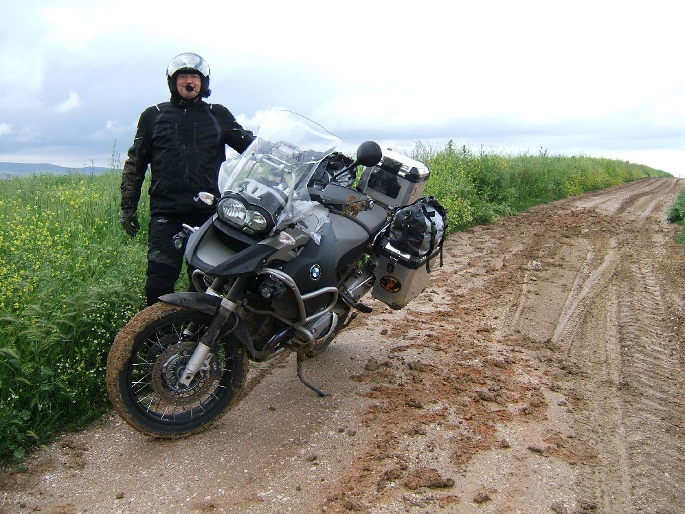 Aber leider machen wir an diesem eh schon aufregenden Tag noch einen gewaltigen Fehler. Da wir partout nicht die Hauptstrasse befahren wollen, wählen wir die ungeteerte Nebenstrasse. Normal kein Problem, und den morgigen Regen – der war ja auch 150km weiter südlch- haben wir irgendwie aus unserem Gedächtnis gestrichen. Ja, und aufgetrocknet war eben nur die Oberfläche, die Staubstraße war in Wirklichkeit ein Schlammloch, in welchem wir uns dann nach nur 100m wiederfanden. Junge, wir sahen vielleicht aus!!!. Nur unsere Helme sind sauber geblieben!!!! |