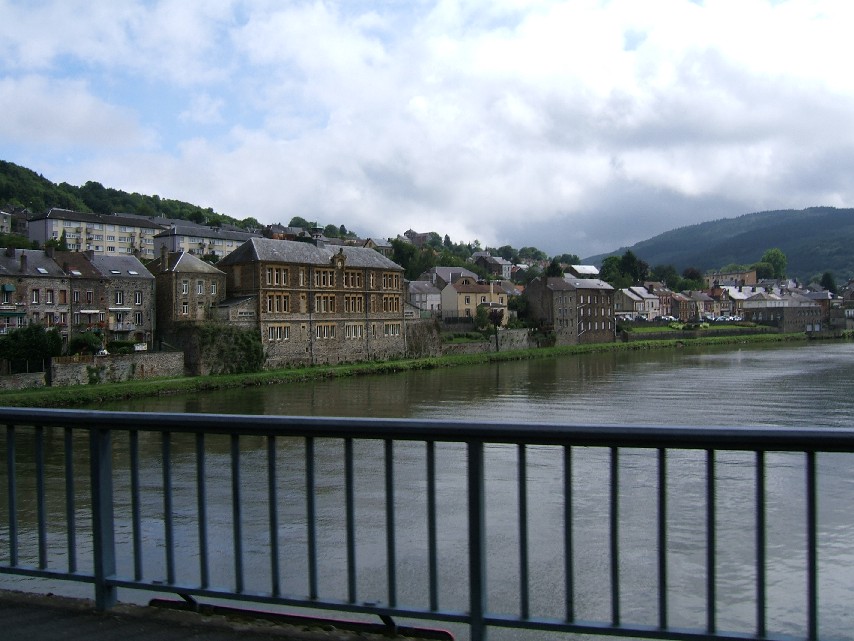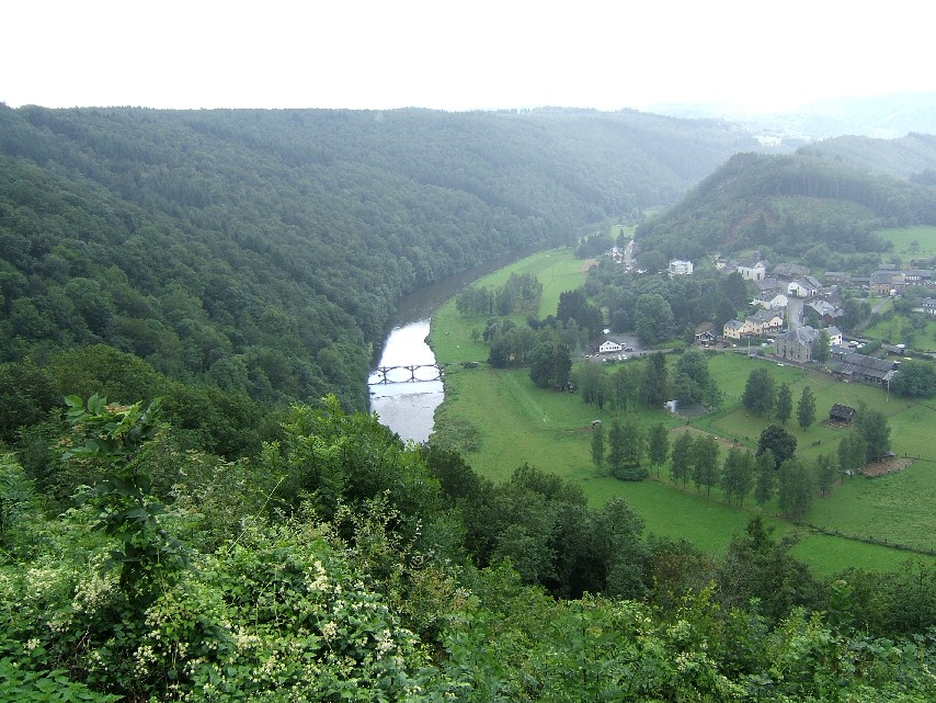 Strassen leerer. Kurz hinter Vresse auf der linken Seite ein Aussichtspunkt: hoch über dem Fluss können wir seinen Lauf, er macht hier eine tolle Schleife, sehen und die Landschaft genießen. Mittagessen ( Picknick) ist am Stadtrand von Bouillon angesagt. Ein wirklich schöner Platz mit Bänken und Tischen unmittelbar an der Semoire, große alte Bäume, eine alte kunstvolle Brücke und über uns mal wieder eine große Befestigungsanlage. Überall in Belgien findet man Befestigungsanlagen, was war bloß früher hier los?? Für Geschichte ist ein andermal Gelegenheit, wir