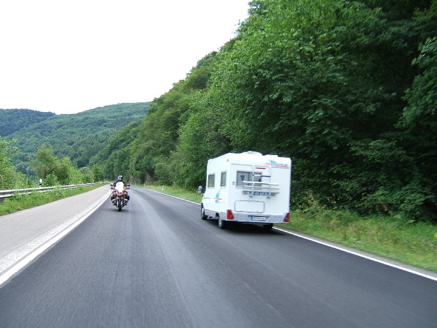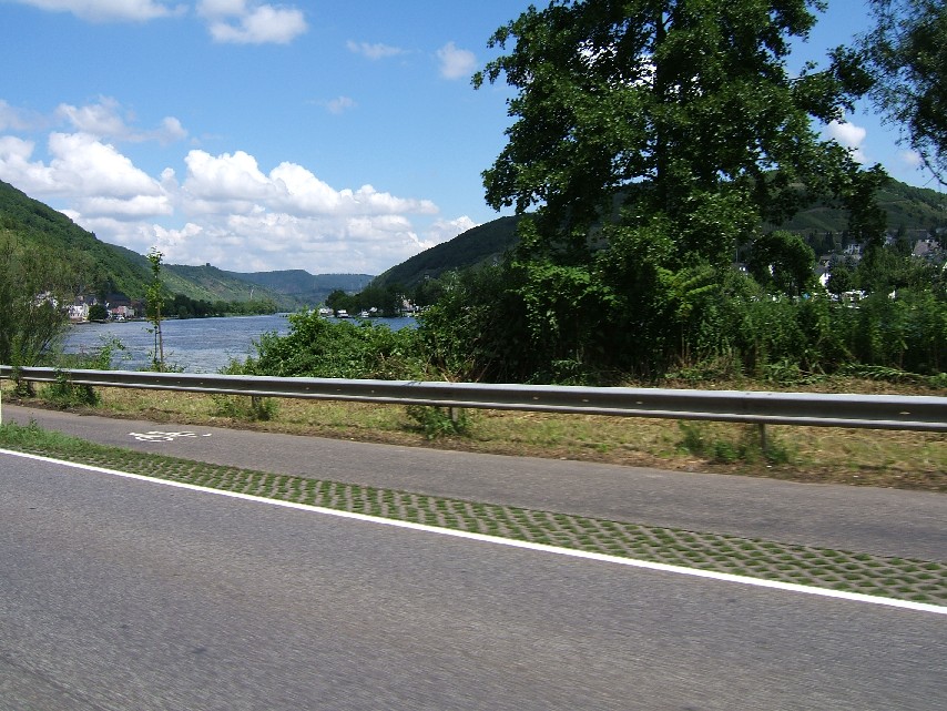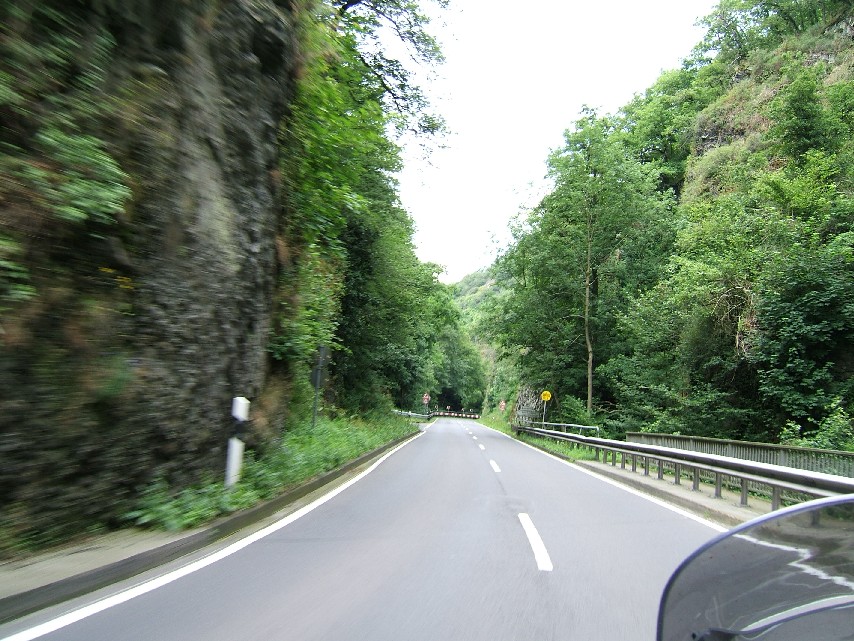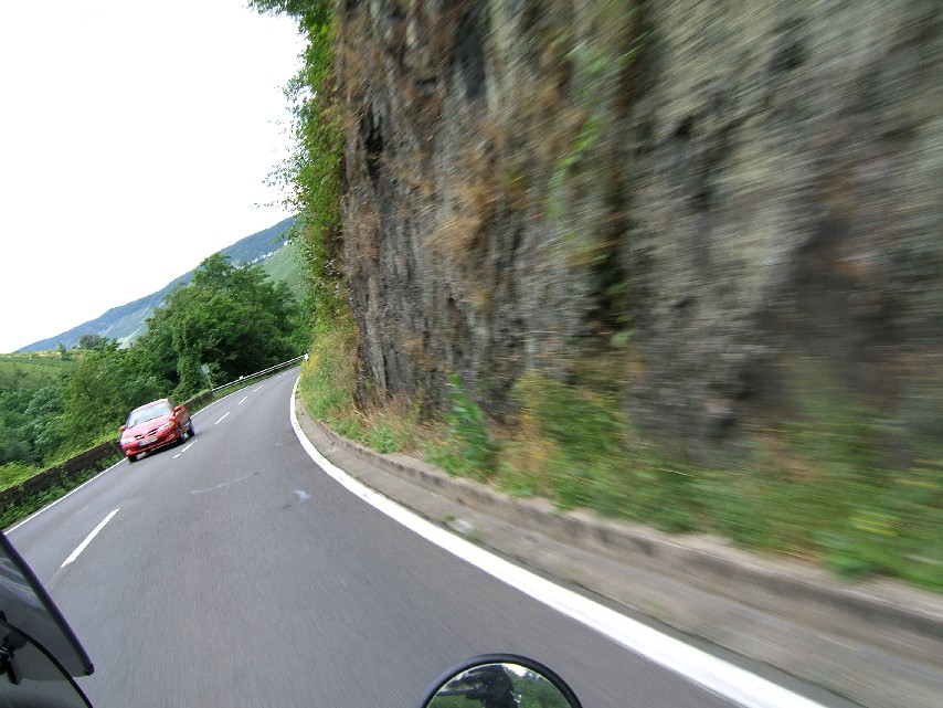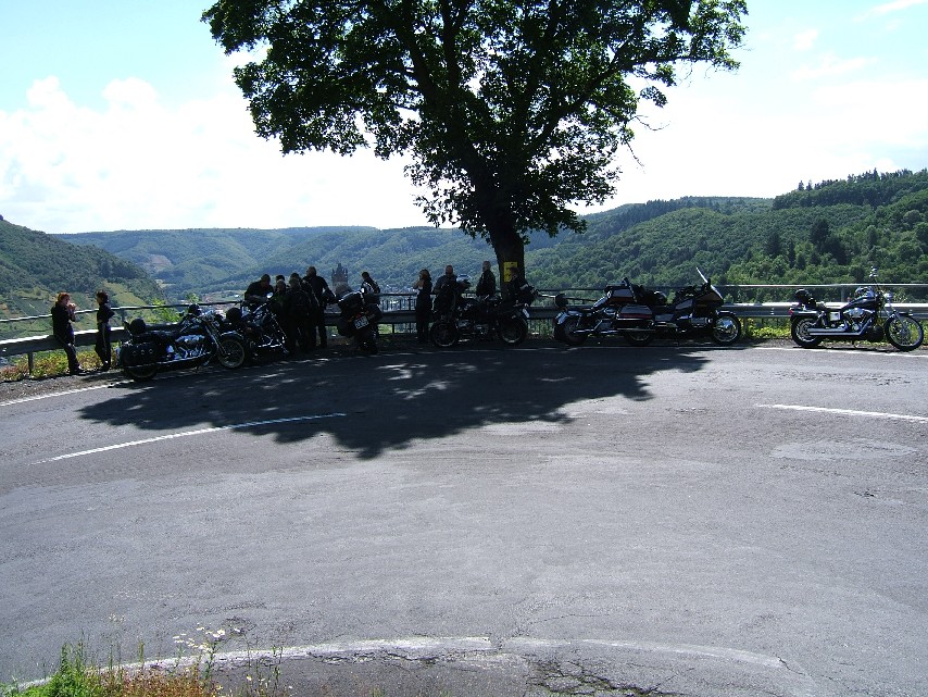 Sträßchen runter bis Cochem! Hier haben wir eine größere Gruppe Harleyfahrer getroffen, die gestern erst aus Schweden angereist waren. Weiter geht es über kleine Sträßchen rauf und dann über echt kleine Sträßchen runter bis ans Moselufer. Am Moselufer ist die Straße natürlich hervorragend ausgebaut. Obwohl wir das erste Ferien Wochenende haben, ist es doch ziemlich still auf den Straßen. Wahrscheinlich hängen die meisten im Ballermann rum!!! Gut für uns!! Nun denn, so soll es sein. Und wieder geht es hoch in die Weinberge und