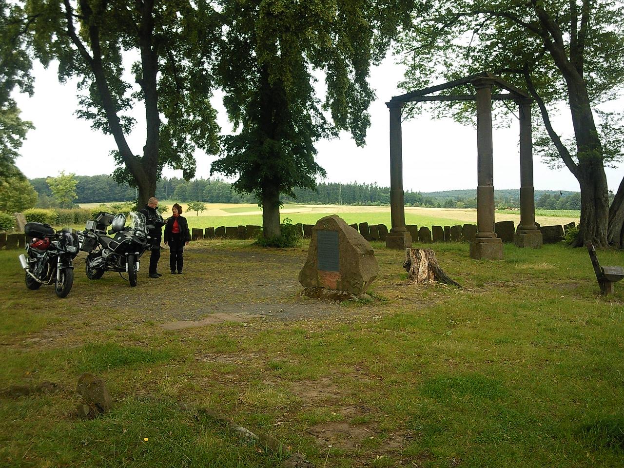 Am nächsten Morgen starten wir nach einem gemütlichen Frühstück gut gelaunt. Über kleinste Straßen kurven wir nach Beerfelden, mit 430M Höhe die höchste Stadt des Odenwaldes. Nur ein kurzes Stück vom Zentrum entfernt ein schauriges Zeugnis der Vergangenheit: Ein sechs Meter hoher Galgen, angeordnet im Dreieck, so dass 6 Verurteilte gleichzeitig erhängt werden konnten. Es ist irgendwie eine